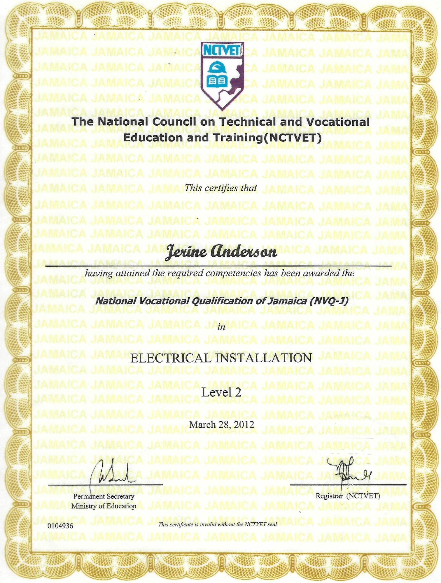 After Graduation from High School I decided to complete a Certification in the Electrical Installation at the Above Rocks Heart Vocational Training Center. After completing that Level II certification, I went on to attending the Portmore Community College where I completed an Associate of Science Degree in Business Studies.